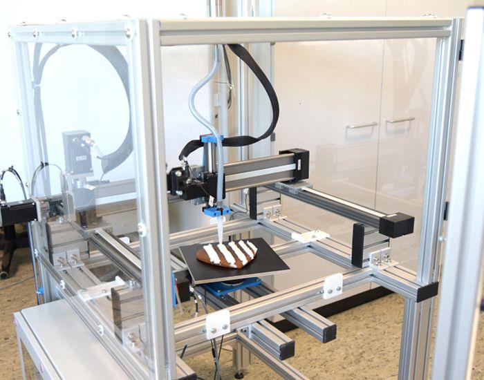 The robotic system automates the precise decoration of confectionery items, ensuring uniform designs and reducing the physical effort required for repetitive manual tasks.